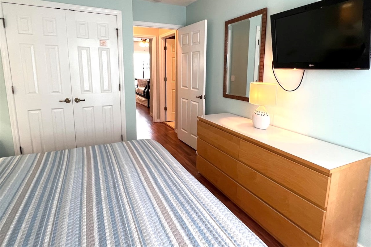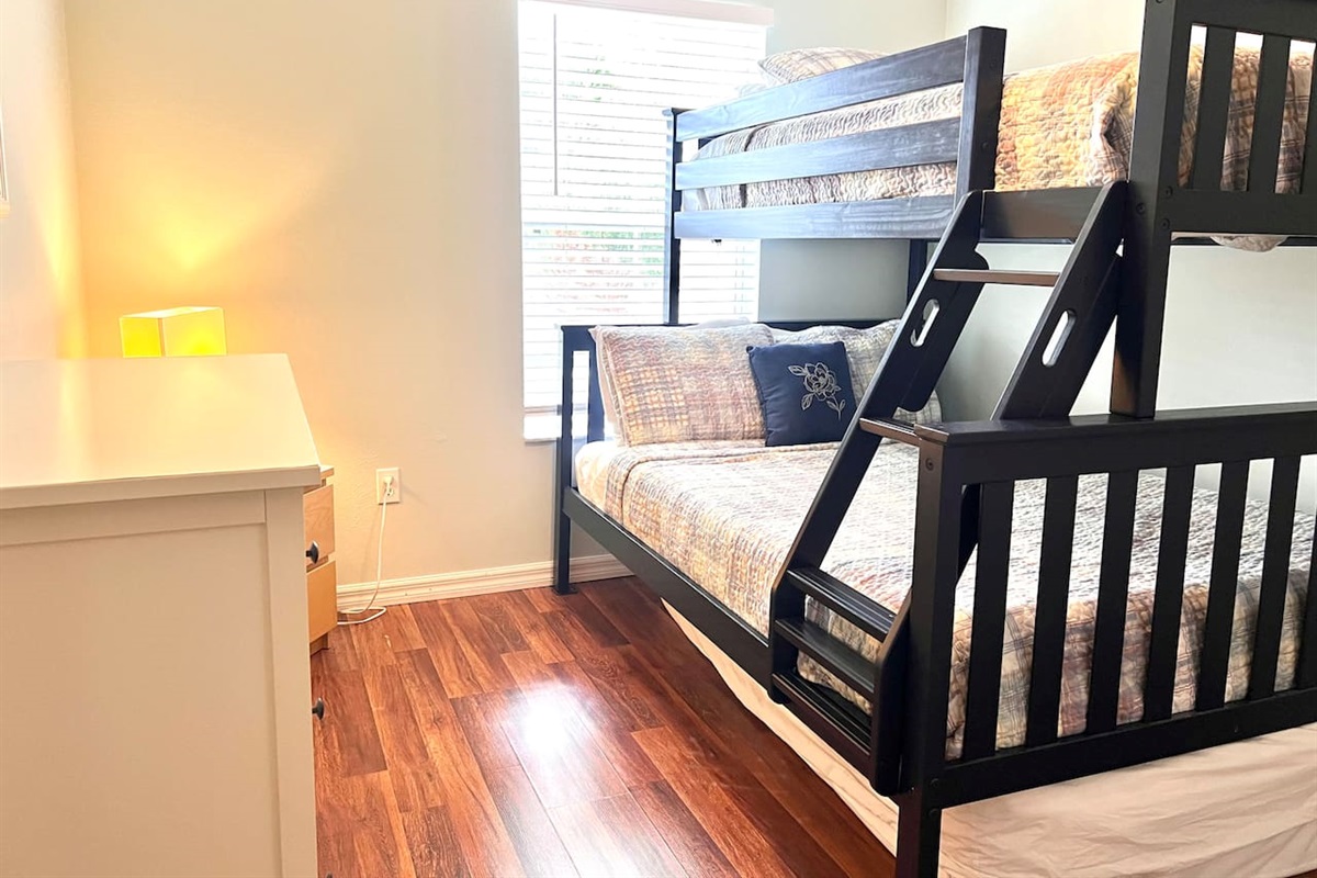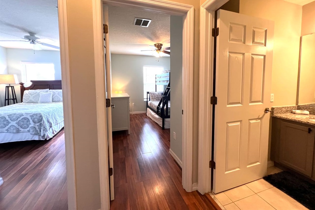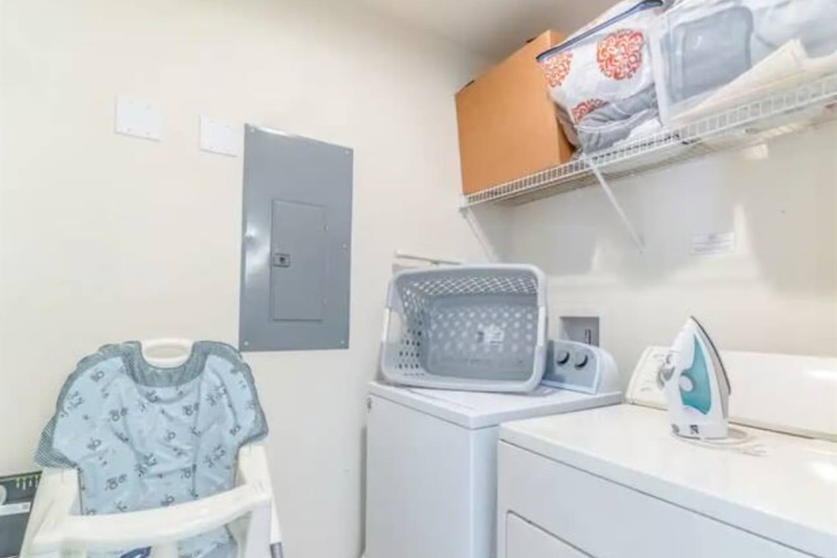 Upstairs, you’ll find a cozy master suite with king bed, a stylish queen room, and a cheerful bunk bedroom perfect for kids or friends. With in-home laundry, Wi-Fi, Smart TVs, and resort amenities including pools, playground, clubhouse, and on-site café, every moment here is effortless and fun.
