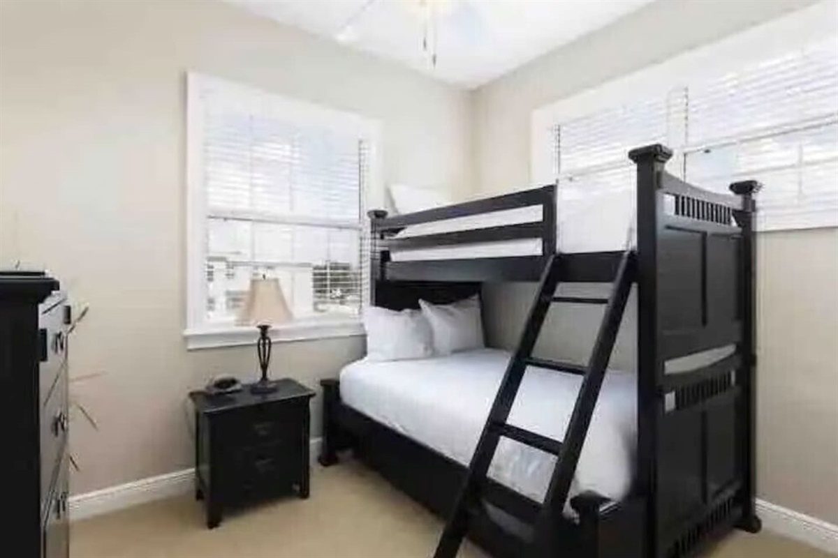Upstairs, beautifully appointed bedrooms include a king master suite with balcony access, a queen guest room, and themed twin and bunk rooms perfect for kids. Each room offers plush bedding and flat-screen TVs.